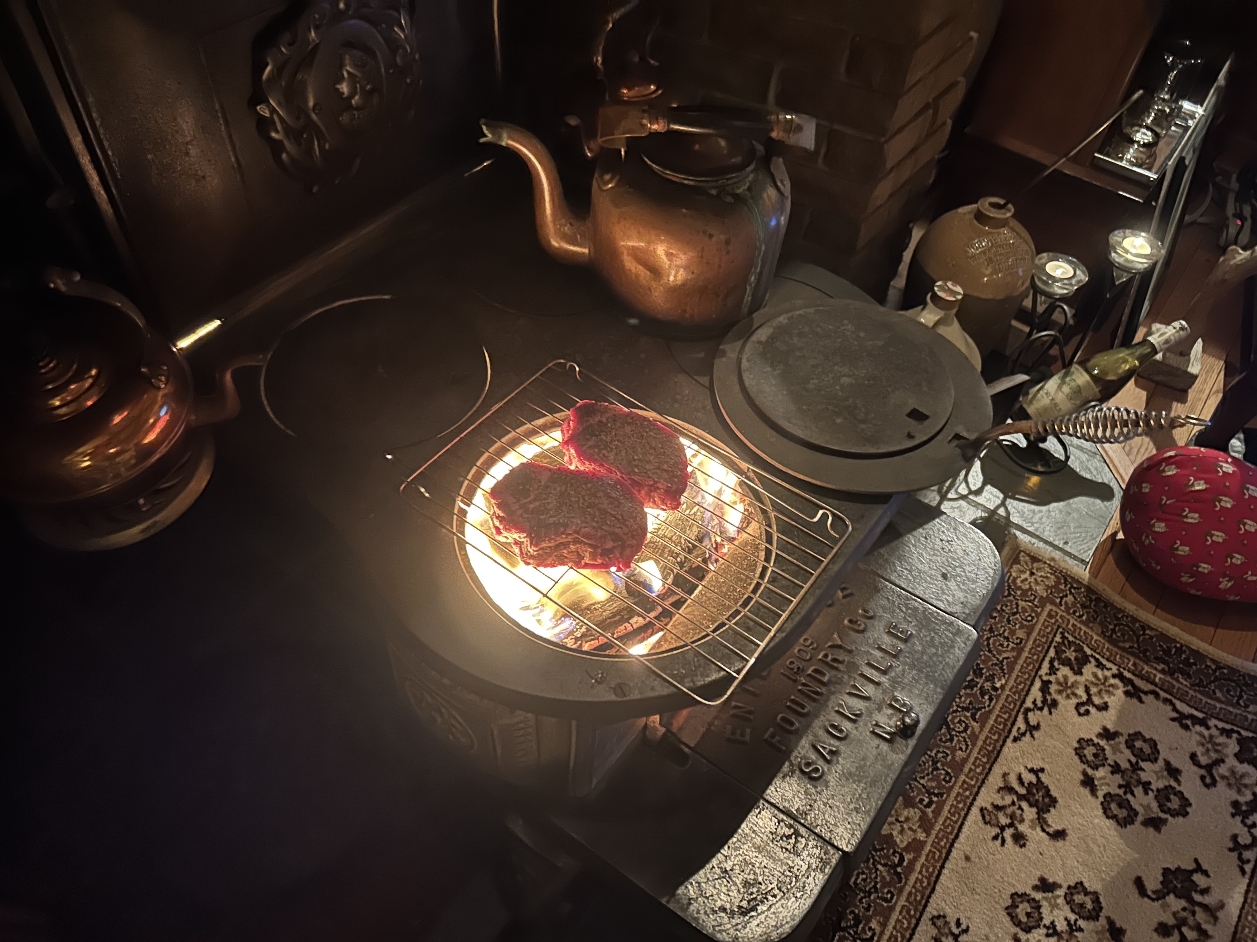 The surprise highlight was dinner. I learned a new way to cook steak on a wood stove: steady heat, smoke pulled cleanly away by the draft, and a perfect, subtle wood‑fired flavor. Simple, clever, and absolutely delicious.